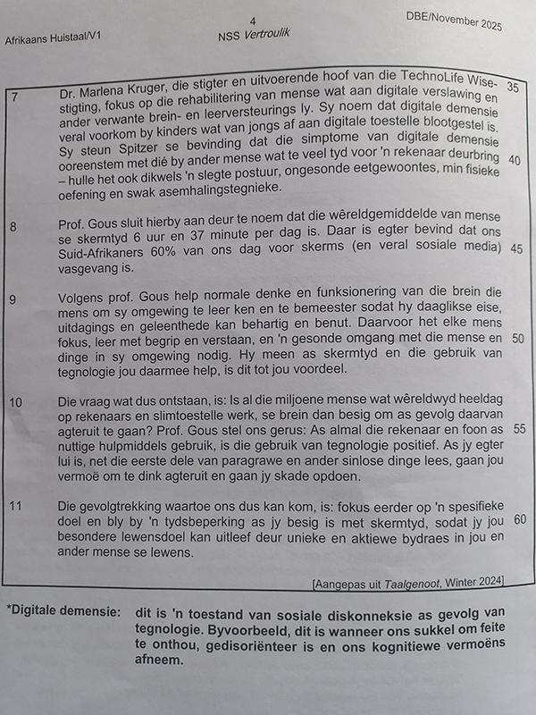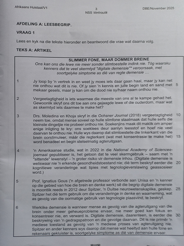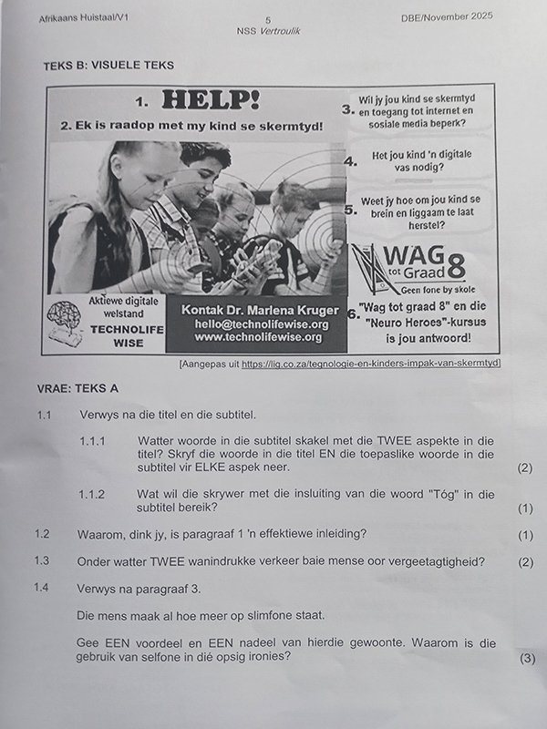 Dit was voorwaar ‘n heerlike WoW-gevoel toe ek ‘n boodskap van ‘n vorige kollega ontvang waarin hy foto’s gestuur het van die bladsye met die begripstoetsteks advertensie en vrae wat in die matrieks se eerste Afrikaanse vraestel ingesluit was.